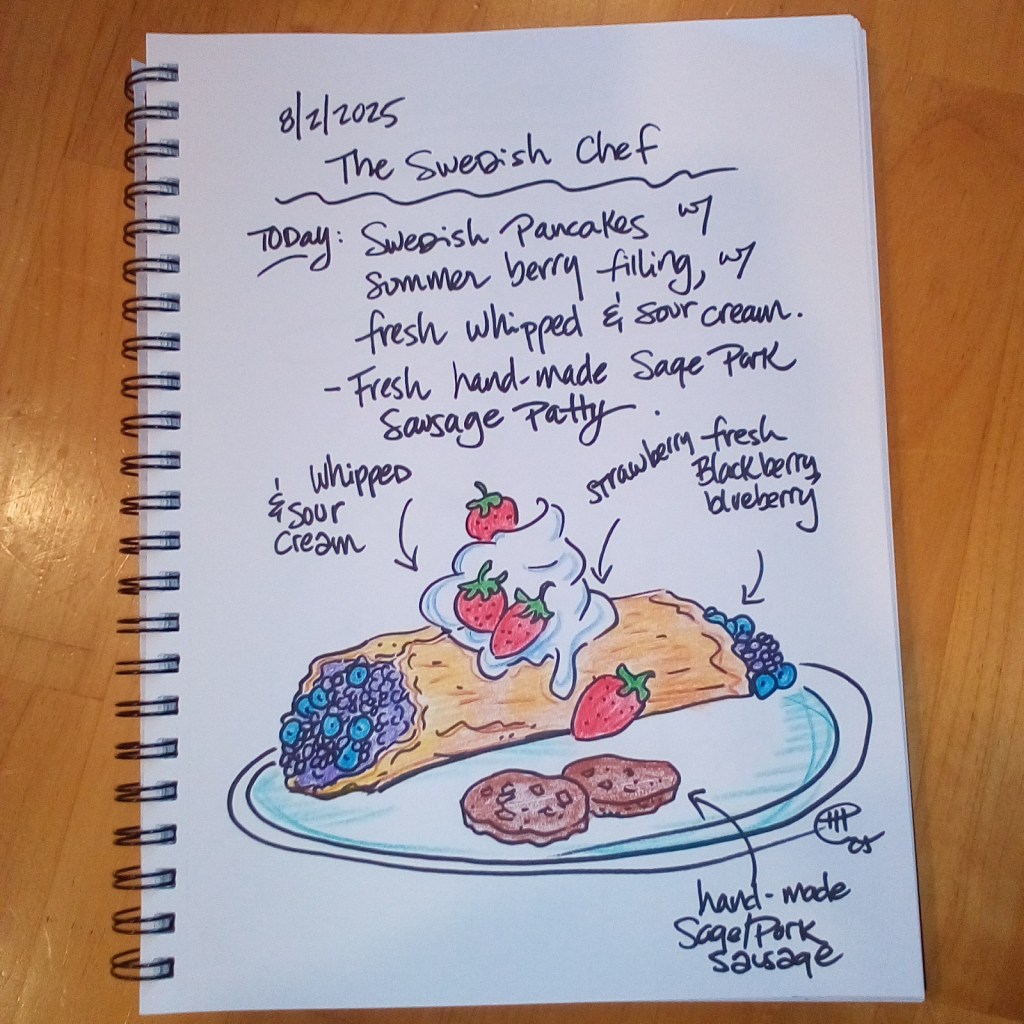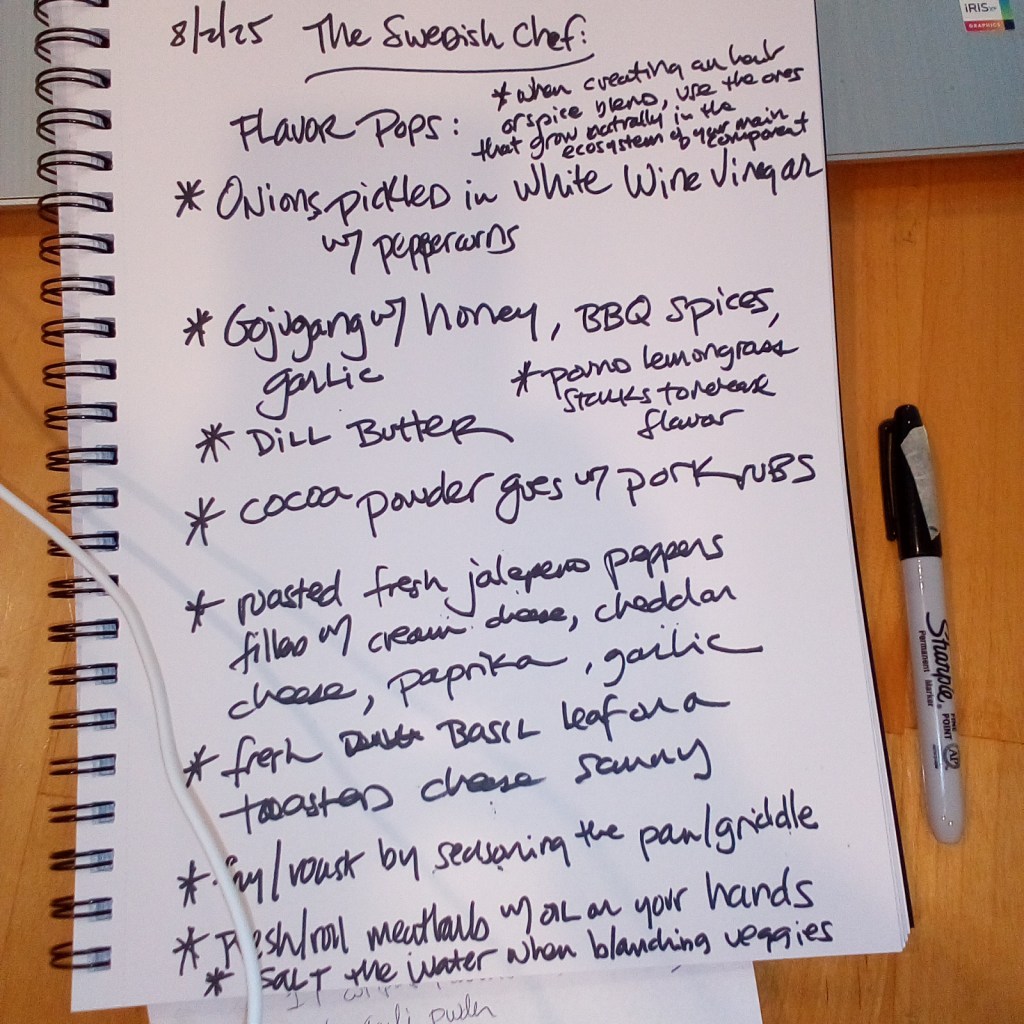 I keep The Swedish Chef Diary (an art sketchbook) to sketch and list and write about the things I will be preparing later, step by step, thought by thought, visual by visual.
