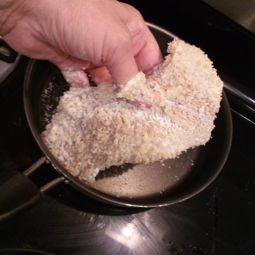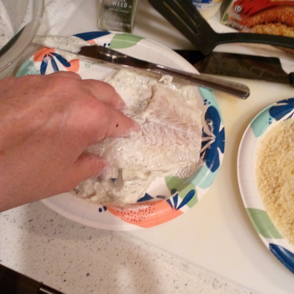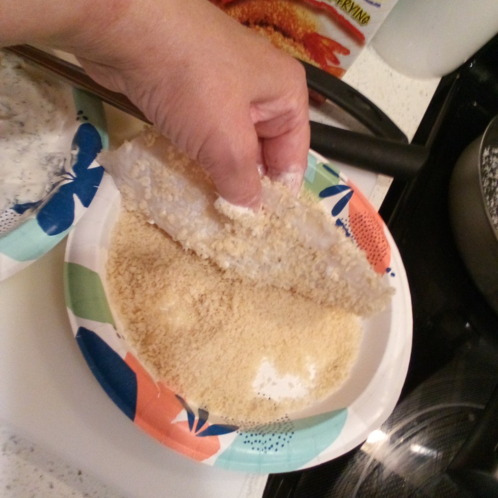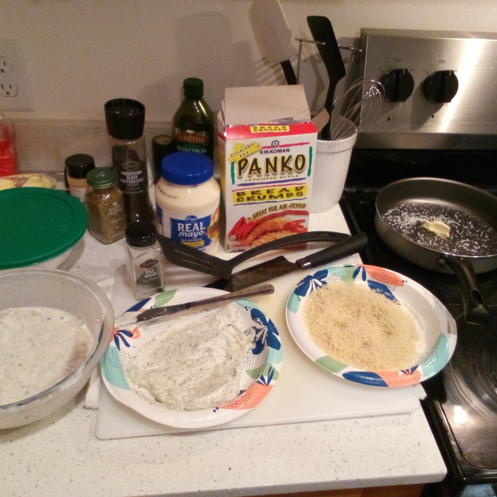 I dredged the marinated Cod in dill mayo, rolled it in Panko, and fried it in a salted pan with butter.