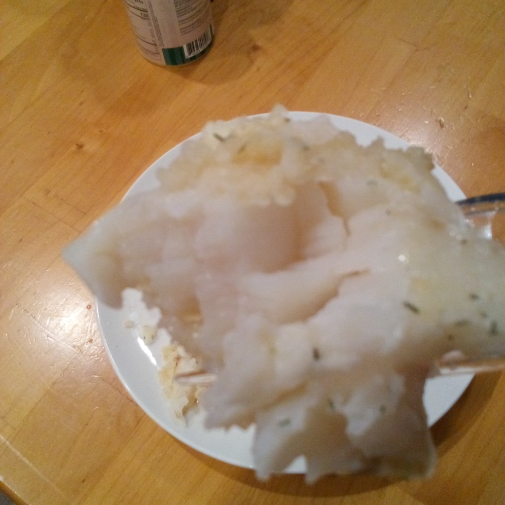 These are my process photos from marinating a fresh (not frozen — if you freeze fish, the water molecules inside the muscle will expand and pummel the meat and make it mushy) Cod fillet in dill buttermilk, overnight in the fridge.