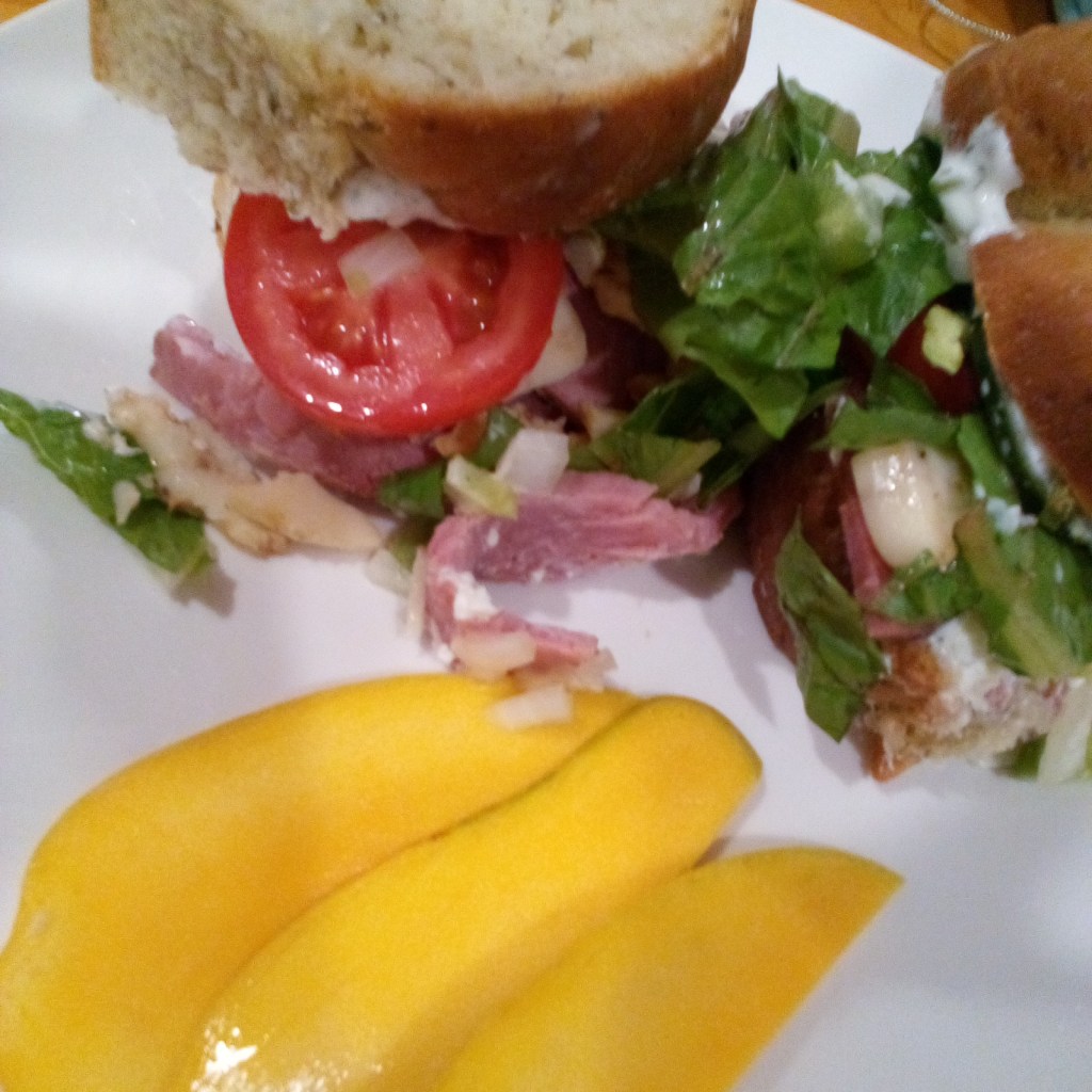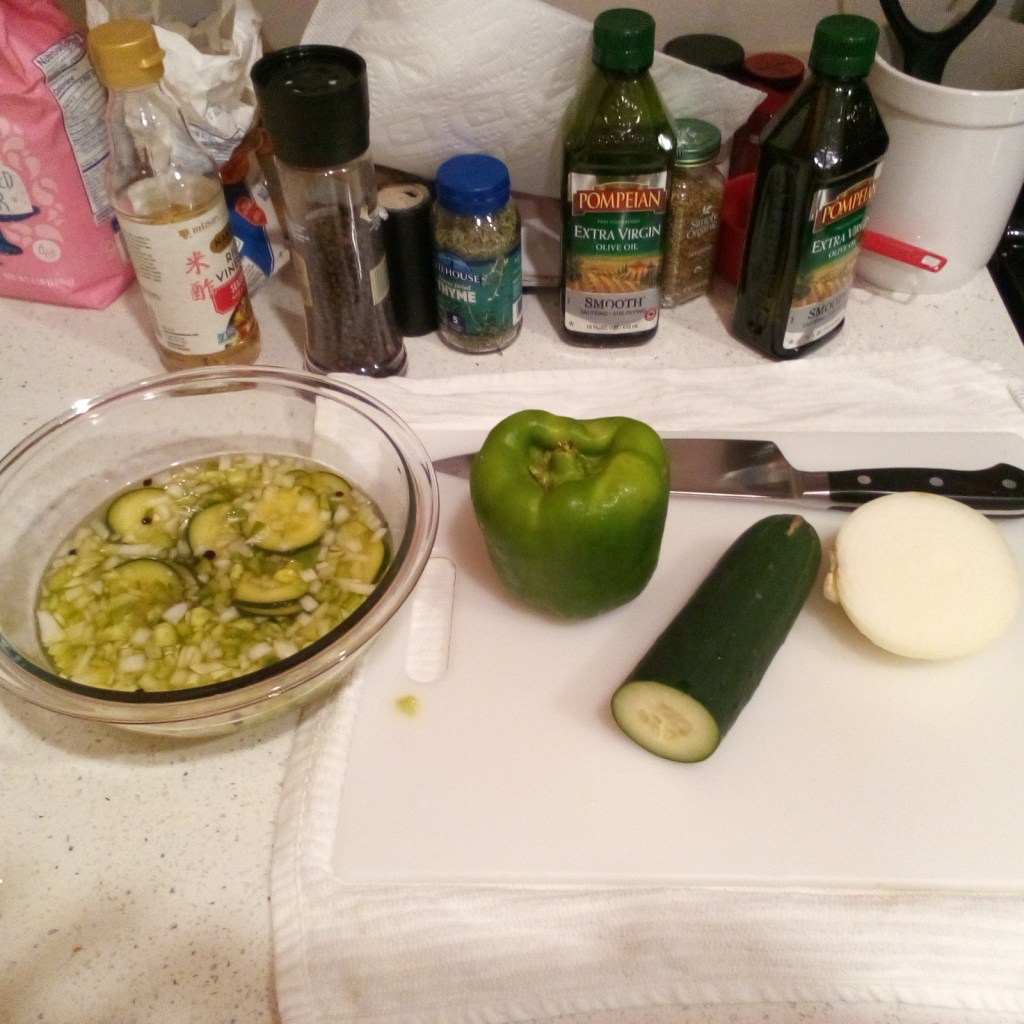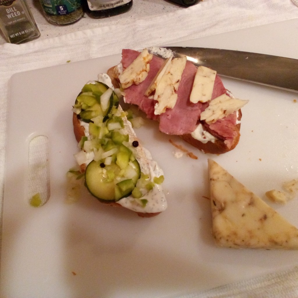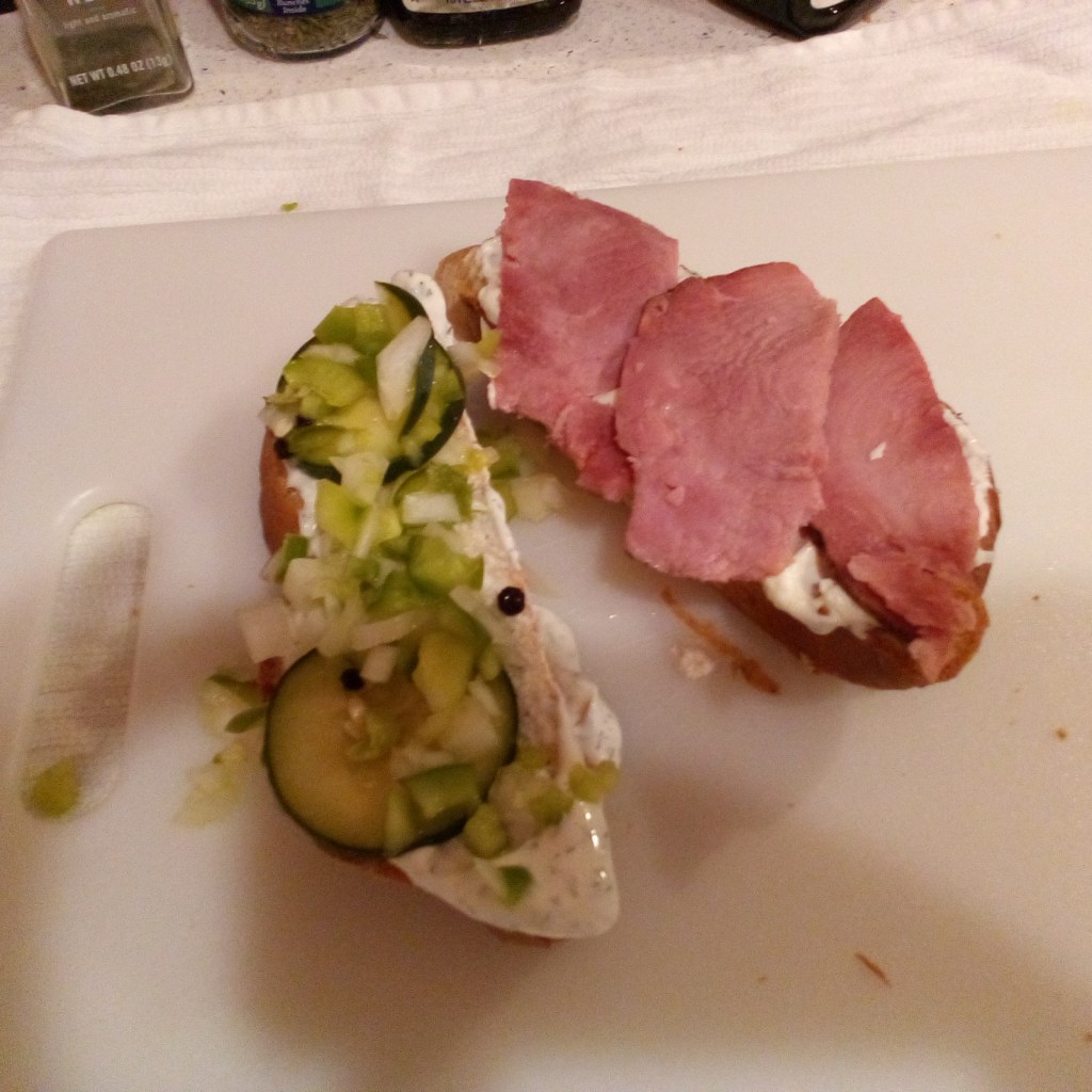 While the bread is rising, build your brined miripoix relish ( in my recipe, onion, bell pepper cucumber with a shaving of frozen (fresh but frozen) jalapeno peppers (just a hint. This is not a heat sannie, nor a spicy sannie. Just very flavorful and bright, with deep savory undertones).