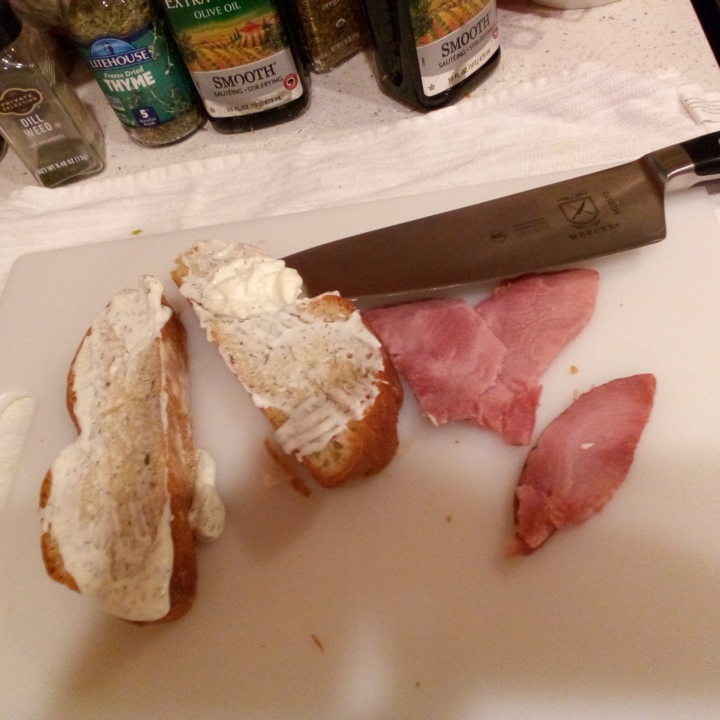 On slices of your Thyme-Oregano bread, spread dill mayo on both sides, lightly.