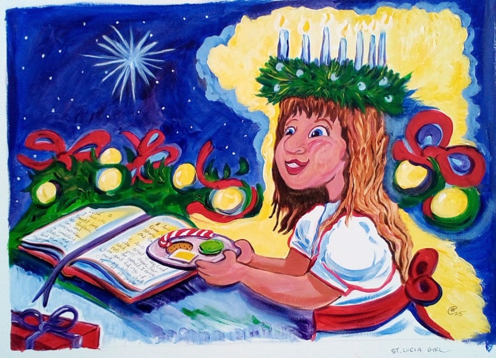 This is a painting of love. Growing up, we had giant Swedish Christmas — and St. Lucia Girl is a part of Swedish Vhristmas.